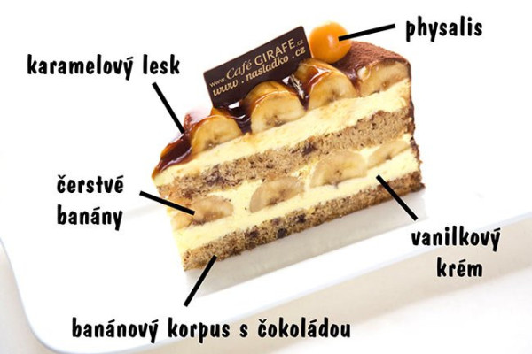 Voňavý dort se spoustou čokolády a karamelu, ale hlavně s 1,5 kg vyzrálých banánů, které jsme nakrájeli do originálního korpusu a proložili jimi vanilkový krém.